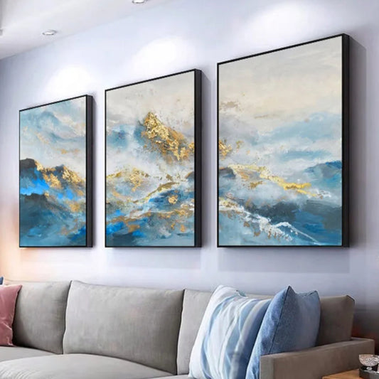 Golden Blue Mountains Set of 3 Wall Hanging Textured Art