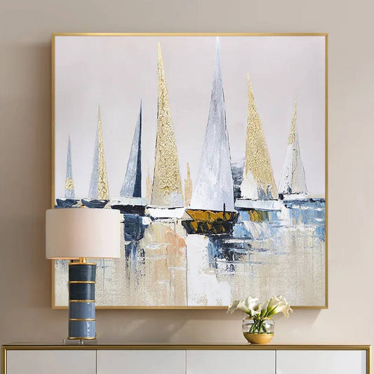 3D Gold Foil Textured Sea Sailboats Canvas Artwork