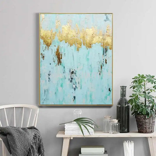 Abstract Aqua Blue and Gold Foil Textured Painting